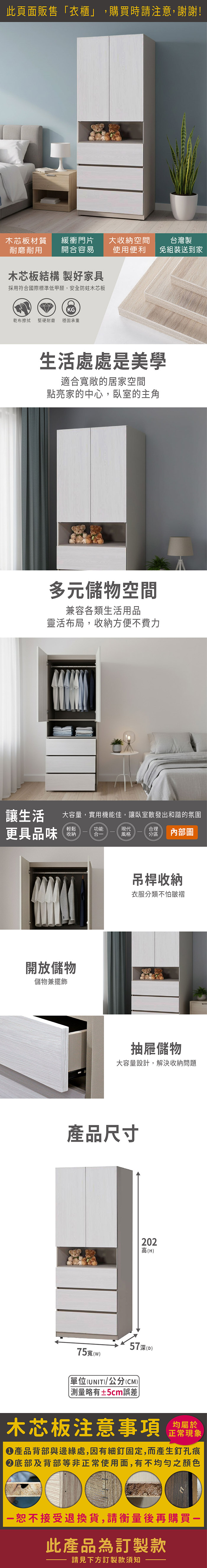 安迪2.5尺三抽衣櫃(寬75x深57x高202cm)(訂製款)