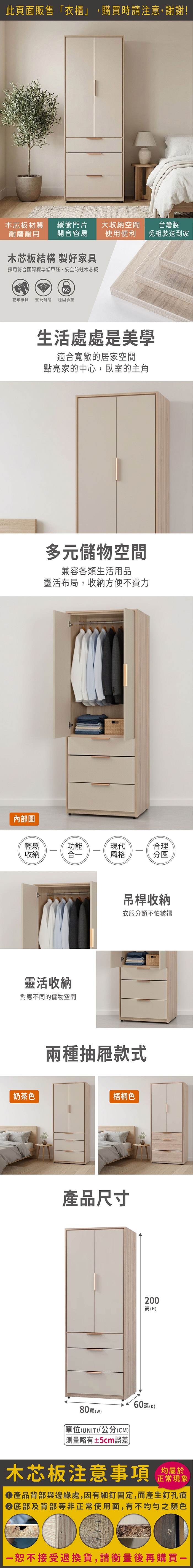 布茲2.7尺雙門三抽衣櫃(寬80x深60x高200cm)