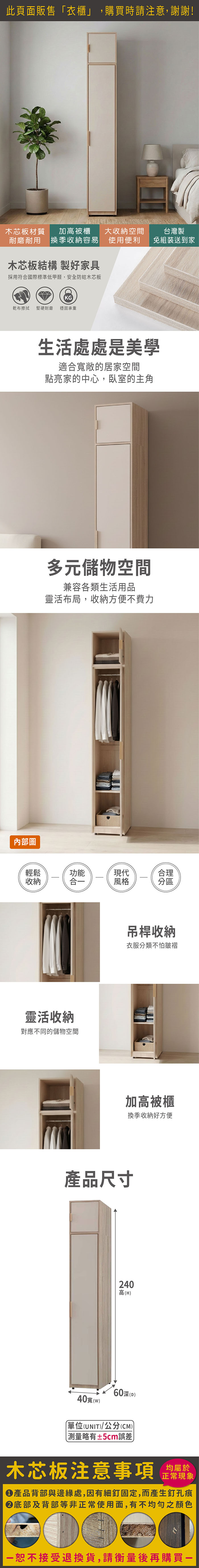 布茲1.3尺加高單吊衣櫃(寬40x深60x高240cm)
