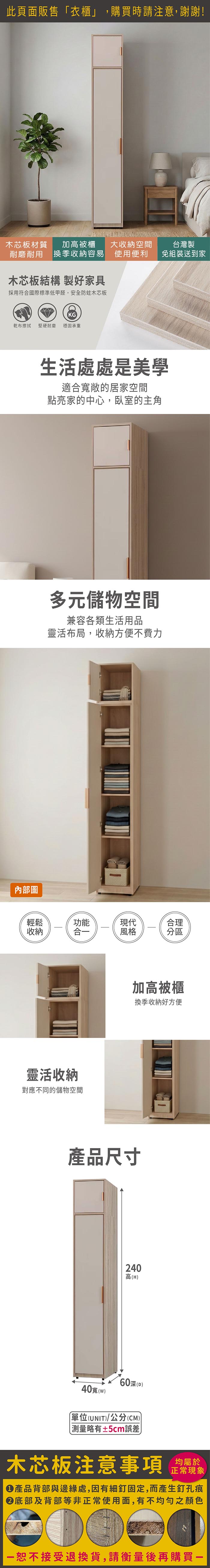 布茲1.3尺加高衣櫃(寬40x深60x高240cm)