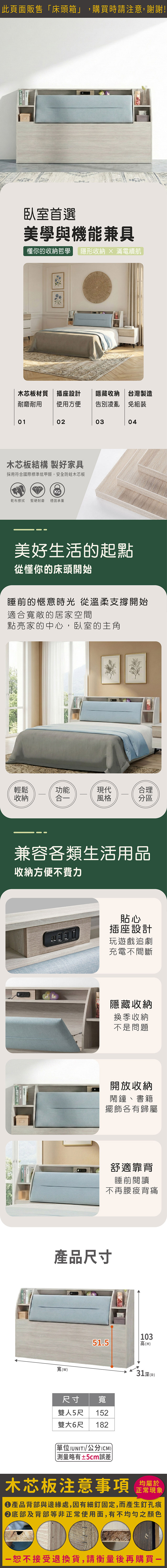 奧思收納插座床頭箱(雙人5尺)