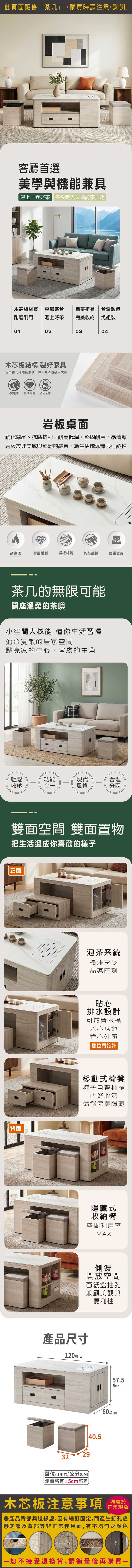 紀春機能岩板泡茶大茶几(附椅凳)